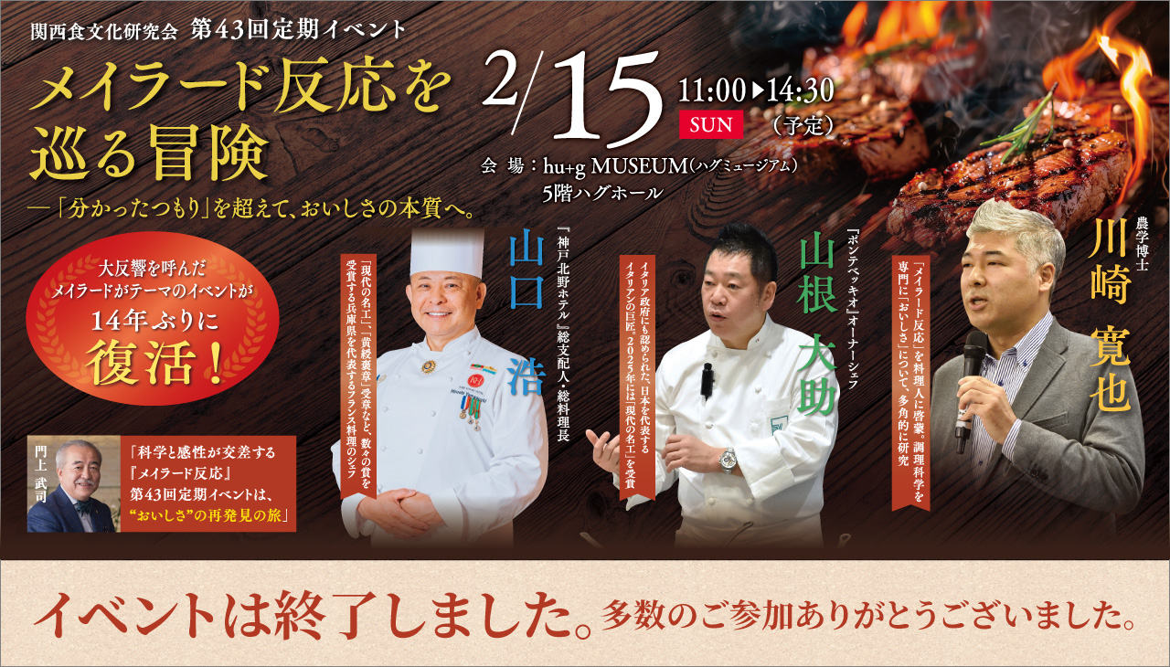 テーマは「メイラード反応」。料理人たちは、まるで調理科学を手中に収めたかのように、この言葉を切り札やお守りのように使います。しかし、私たちは本当に「メイラード反応」を理解しているのでしょうか?耳にした側も、どこかで「わかった気」になってはいないでしょうか。2011年、関西食文化研究会にて川崎寛也先生が発した「メイラード反応とは何か?」は、料理界にセンセーショナルな波紋を広げました。あれから15年近く。今こそ、あの熱狂を再訪し、「メイラード反応」を再検証する時ではないでしょうか。みなさま是非ご参加ください!