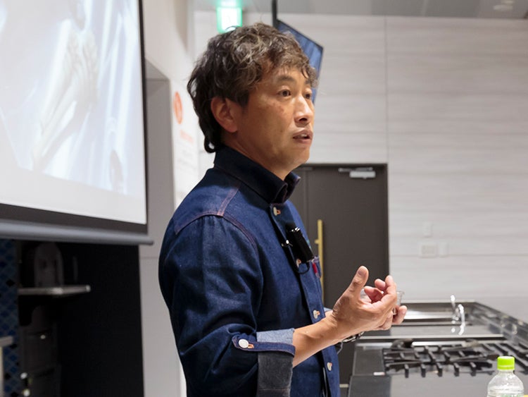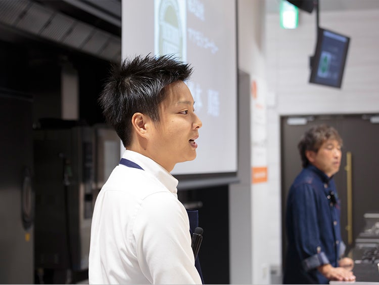 本日、食べていただいてないものの中にあるショコラ「こがし醤油」では、うま味を追求しました。日本では、すき焼きにしても醤油を加熱する。醤油の中の糖分がキャラメル化する。つまり、メイラード反応をうまく活用することがおいしいお菓子につながるのですね。 その一方で、ショコラにしたものを、もう一回、パティシエとしての切り口でお菓子に変えることもしています。今年は、冬から「こがし醤油パイ」を出します。こがし醤油は、小山薫堂さんに「下鴨茶寮」で「粉しょうゆ」に出合わせてもらい、これおいしいなと思って、そこからつくろうと始めたものです。