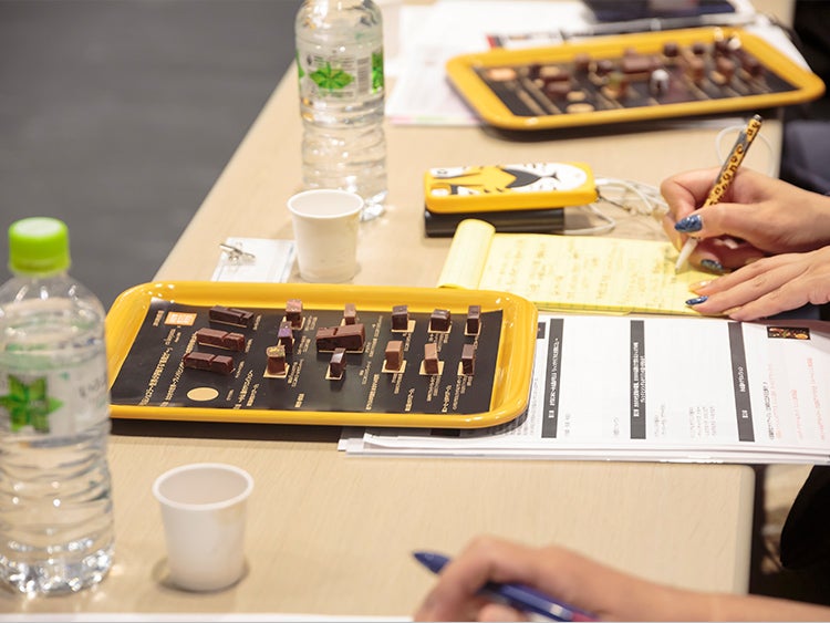 この小さい一粒の中にいろんなことができるのがプラリネです。「水分0%の可能性」とタイトルをつけているのも、水分がないから閉じ込められるものの可能性が広がるということです。ガナッシュだと、フリーズドライは中に入れたら水分を奪ってふやけてしまう。口の中に含めて唾液という水分に出合うまでは固く、サクサクしたままでパッとすぐには開かないわけで、口の中でだんだん形状が変わっていきます。どういう味で終わらせるかも自分の中でイメージしながら、そうなるようにカカオを選んだり、コーティングの厚さを決めたりするわけです。大層につくっているように思われるかもしれませんが、実験をたくさんするだけです、簡単にいえば。思った通りにならないこともいっぱいあります。 結構口に残るので、次の試食のために口の中を一度リセットしてくださいね。