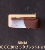 2012年に発表したNINJA(忍者)。大好きな漫画「NARUTO-ナルト-」から発想して、これが最優秀賞をとった時、作者の岸本斉史さんからお祝いに絵をプレゼントしてもらいました。自慢です。「NARUTO-ナルト-」を読んでいる人しかわからないけど、“この場面”という絵まで浮かびながらつくりました。そうやって発想はつながっていくんです。カカオはエクアドルのアリバナショナルです。木、植物のつながりだから。樹の薫香をうつすのをショコラで試してみようというところから実験を始めました。これを披露してからヨーロッパでスモークのショコラがえらく増えました。が、どんなカカオでもクーベルチュールでも合うかというと、そういう訳にはいきません。ベネズエラのスルデルラゴでやってしまうと食べられません。煙をつける方法はいろいろと実験した結果、一つの方法に絞りました。エクアドルのアリバナショナルというカカオのミルク・チョコレートを刻み、スモークマシンのボックスに入れ、蓋をして中に煙を入れ込んで薫香を移します。この時にショコラの刻む粗さをいろいろ試し、「何分おいたらスモークのいい香りを抱いてくれるか」という実験の結果、時間を決め、刻む大きさを決め、そのショコラに煙を宿して生クリームと乳化させてガナッシュをつくっています。