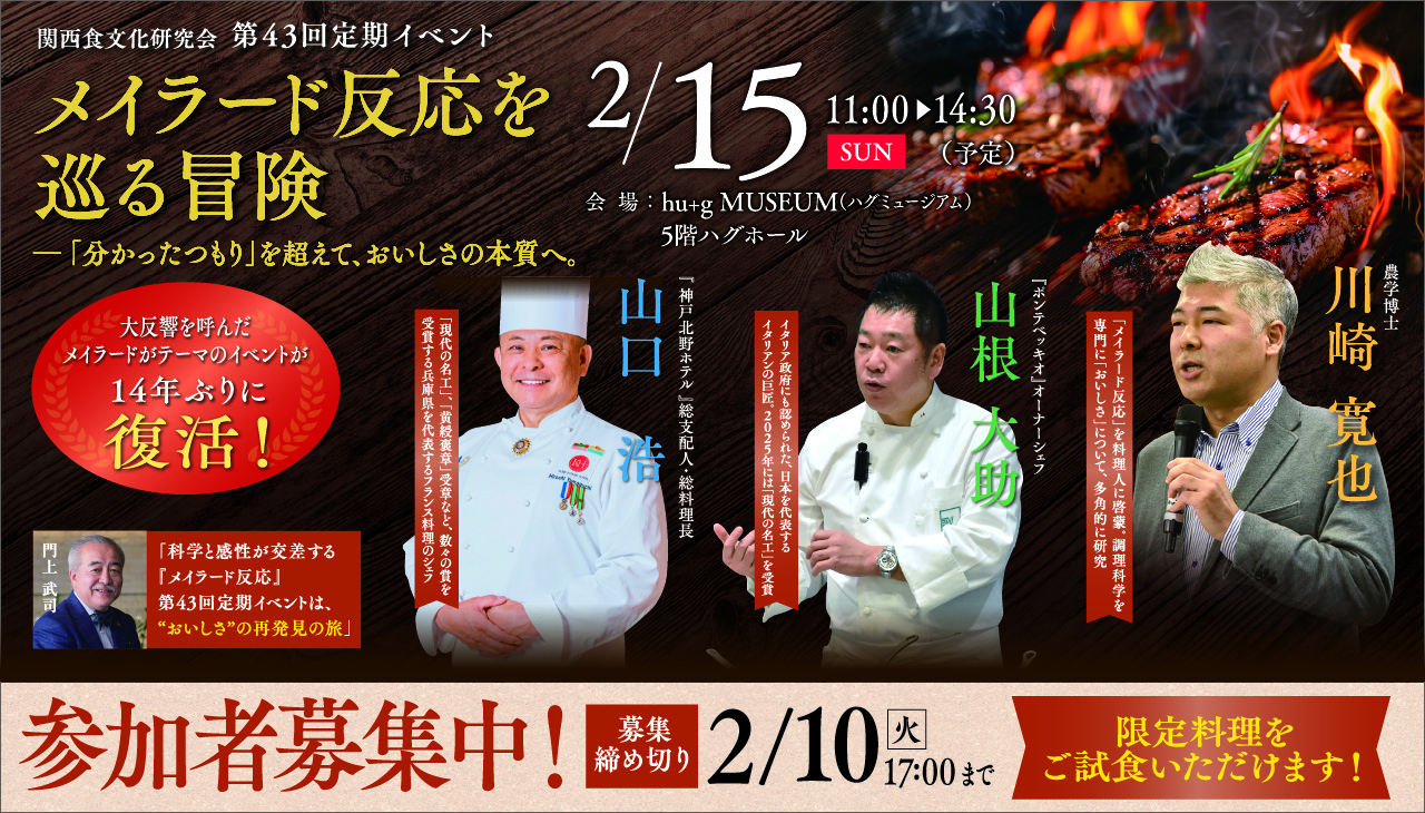 テーマは「メイラード反応」。料理人たちは、まるで調理科学を手中に収めたかのように、この言葉を切り札やお守りのように使います。しかし、私たちは本当に「メイラード反応」を理解しているのでしょうか?耳にした側も、どこかで「わかった気」になってはいないでしょうか。2011年、関西食文化研究会にて川崎寛也先生が発した「メイラード反応とは何か?」は、料理界にセンセーショナルな波紋を広げました。あれから15年近く。今こそ、あの熱狂を再訪し、「メイラード反応」を再検証する時ではないでしょうか。みなさま是非ご参加ください!