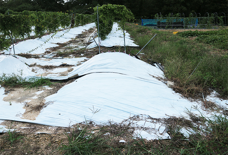 自然薯と波板の間に雨水が入らないよう、畝の表面をマルチでしっかりカバーすることが大切。